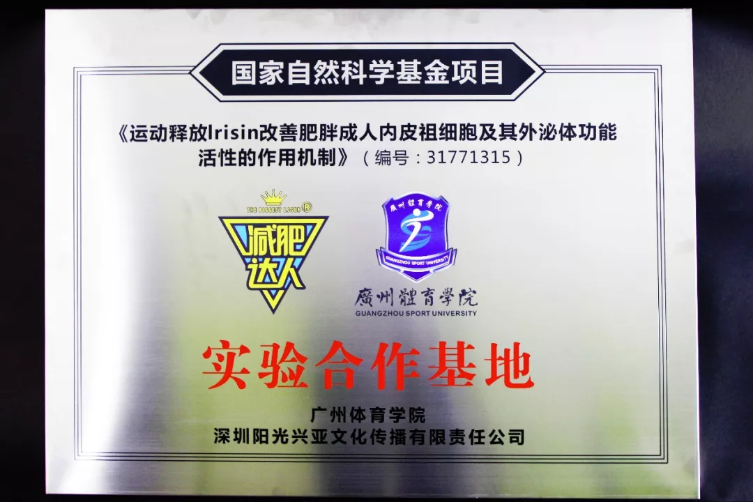 12月27日,减肥达人和广州体育学院合作的研究项目《运动释放lrisin改善肥胖成人内皮祖细胞及其外泌体功能活性的作用机制》获得国家自然科学基金资金资助,深圳阳光兴亚文化传播有限责任公司(减肥达人)作为实验合作基地获得项目授牌,广体院胡教授、雷教授、黄俊豪博士、廖静雯博士、项明强博士,阳光兴亚公司领导李亚兴、陈华毅共同出席授牌仪式。