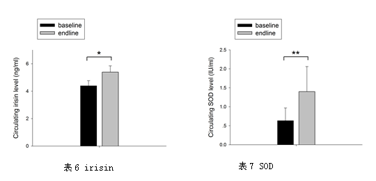 血清氧化应激标记和炎症因子:血管内皮生长因子VEGF(P<0.05)、 内皮祖细胞eNOS(P<0.01)、鸢尾素irisin(P<0.05)(表6)、超氧化物歧化酶SOD(P<0.01)(表7)和脂联素(P<0.05)水平显著增高。